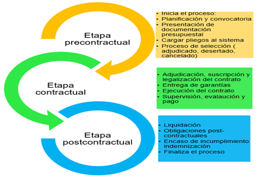 Los procesos de contratación están divididos en etapas, tal como se aprecia en la figura 1, las mismas que sirven para potencializar los procesos y culminarlos con éxito, siguiendo un orden cronológico y específico.
