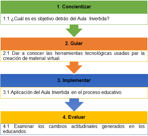 1. Concientizar: La creación de espacios de discusión en la que se compartan experiencias sobre el uso del Aula Invertida es esencial para aclarar dudas o malinterpretaciones sobre este enfoque ya que como se observó en los resultados el desconocimiento de su finalidad es común entre los docentes. Otra opción que se puede aplicar en este paso es la creación de podcasts en los que se incluya la información relevante sobre esta metodología para que de esta manera el mensaje sea difundido en diferentes medios sociales.