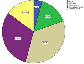 El Figura 1 da a conocer que los docentes si utilizan recursos digitales para impartir clases teniendo una suma 80,46% desde ocasionalmente hasta todas las clases contra un 19,54 que es nunca y casi nunca.