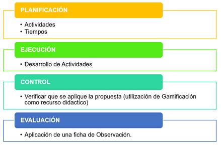 Luego de haber realizado la investigación sobre Gamificación como instrumento pedagógico en los Centros de Desarrollo Infantil, se evidencia que se utiliza de una manera parcial; por lo tanto, se propone utilizar la Gamificación dentro de las actividades lúdicas, puesto que favorece el desarrollo de la psicomotricidad en los niños de sub inicial 1; por consiguiente, se realiza una planificación, misma que es ejecutada por las educadoras; control a las educadoras con el fin de conocer si beneficia emplear Gamificación dentro del desarrollo integral de los niños, y por último se evalúa los avances de los niños a través de una ficha de observación.