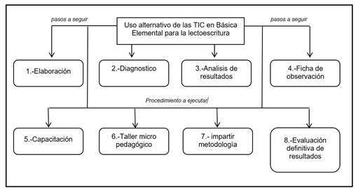 This research aims to determine the levels of acceptance and implementation of Information and Communication Technologies (ICT) in the teaching process of literacy at the elementary basic sub-level. The research work was descriptive. The results show that teachers consider the use of ICTs to be important for the development of literacy, since children show high levels of interest in the use of technology. With this premise, a proposal for the implementation of ICTs for development is established. of literacy in the School, which motivates students towards a balanced and interpretive Education, based on the acquisition of competences, skills and the development of the imagination, embodied in texts enriched with the use of technological tools, which increase individual participation and collective inside and outside educational institutions.
