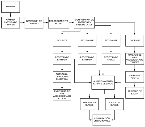El uso de este prototipo logró automatizar el proceso de registro de asistencia a clases de los docentes y estudiantes en los laboratorios de cómputo mediante el reconocimiento facial, facilitando esta tarea con rapidez y exactitud. El docente se coloca frente a la cámara que está en la parte de afuera del laboratorio de cómputo, por reconocimiento facial se activa el dispositivo que abre la puerta, enciende el aire acondicionado y las luces. Posteriormente los estudiantes se colocan uno por uno frente a la cámara que realiza la detección del rostro comparándolos con los almacenados en la base de datos quedando registrada la asistencia a clases con la fecha, hora de entrada y salida, los registros de asistencia a clases en el laboratorio de cómputo reposan en una página web diseñada para este propósito.