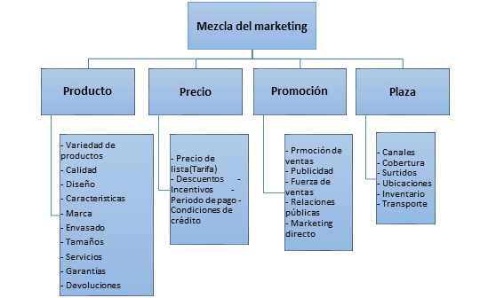 El marketing mix, según Kotler, Kartajaya, & Setiawan (2018) afirman "Es una herramienta clásica para ayudar a planificar que ofrecer a los consumidores y como ofrecérselo" (p.8). Para poder comprender claramente que es el marketing mix conocido también como mezcla del marketing se debe identificar variables internas conocidas como las 4P's del marketing: Producto, precio, plaza y promoción, en que consiste cada una de ellas según su autor (McCarthy, 2012). Producto, es el principal elemento por el cual va a girar toda una acción este puede ser tangible o intangible, las empresas deben colocarlo en el mercado para que los clientes satisfagan sus necesidades. Precio, es el valor monetario que posee en el mercado un producto o servicio, es complicado fijarlo, para las empresas representa sus ingresos. Plaza, donde vamos a comercializar nuestro producto. Promoción, de qué manera lo vamos a dar a conocer en el mercado.