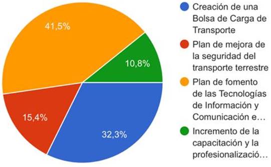 Del total de las personas encuestadas, el 41,5 % afirman que establecer un plan de fomento de las TIC’s (Tecnologías de Información y Comunicación) resulta relevante para mejorar la productividad del transporte, mientras que, el 32,3 % mencionan que crear una bolsa de carga de transporte, es la solución más idónea para este fin.