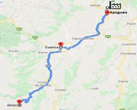 Por otro lado (Heizer & Render, 2008) mencionan que la modelización del transporte, pretende ejecutar los envíos de una manera más eficiente, esto es, desde la empresa hasta los diferentes destinos, como se muestra en la Figura 11, abarcando poblados cercanos a las ciudades principales como son Azogues, Cuenca y Girón.