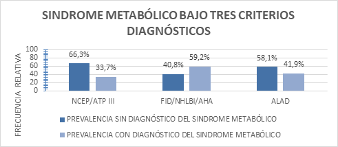 De igual forma, en otras poblaciones de Latinoamérica se evidencia porcentajes semejantes como un estudio realizado en Venezuela, expresando un mayor valor dentro de las definiciones ALAD y NCEP/ATP III con el 39,1% y 38,3% respectivamente 27. En Perú se identificó prevalencia del síndrome en una población de 260 individuos con el 46,2% bajo los criterios ALAD y del 48,1% IDF/NHLBI/AHA 28, finalmente, agregando a lo anterior, Brasil demuestra prevalencias similares al estudio bajo los criterios IDF/NHLBI/AHA con el 56,9% 29.
