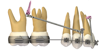 Esta técnica consiste en mejorar el perfil convexo y el sobrecrecimiento vertical con control sagital y vertical de la dentición, utilizando anclaje absoluto mediante minitornillos infracigomático (diámetro, 1,6 mm; longitud, 11 m) y también para la retracción e intrusión de los dientes anteriores, además de utilizar minitornillos a nivel mandibular para distalizar (Figura 5).