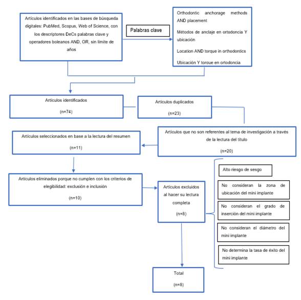 Objetivo: El objetivo de esta revisión sistemática fue analizar el éxito en la colocación de los mini tornillos en ortodoncia según su ubicación y grado de inserción. Métodos: Se realizó un levantamiento sistemático de información mediante la búsqueda de artículos científicos en tres bases digitales tales como; Scopus, PubMed, Web of Science, a través de los descriptores de ciencias de la salud en español e inglés DeCs con sus respectivos operadores booleanos and, or, not, siguiendo los criterios PRISMA. Resultados: Se identificó múltiples investigaciones que estudiaron la tasa de efectividad en la colocación de los mini tornillos, dando como resultado que los mini tornillos ubicados en el maxilar brindan mayor estabilidad que los de la mandíbula, además que un ángulo de inserción de 90° podría brindar mayor estabilidad biológica al presentar mayor superficie ósea de retención.