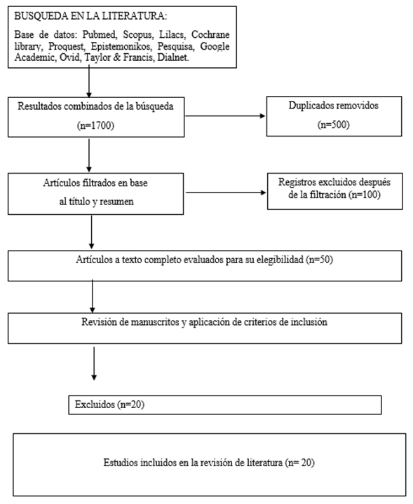 Se realizó un primer cribado dejando 850 artículos; luego de esta selección, se eliminó la bibliografía duplicada, quedando 500 artículos. Después de verificar todos los registros, se excluyeron 486 estudios que no cumplieron con los criterios de selección, lo que resultó en 20 artículos adecuados para esta revisión de literatura. En esta revisión se consideró que los estudios de cohorte-prospectivo representaron el 30%, de caso-control el 35%, estudios clínicos el 13%, revisión sistemática 9%, con el menor porcentaje revisión de la literatura.