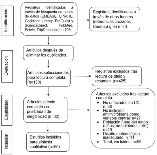 La búsqueda se realizó utilizando descriptores DeCS/MeSH relacionados con 'infecciones nosocomiales', 'resistencia antimicrobiana', 'unidad de cuidados intensivos', 'estrategias de prevención' y 'rol de enfermería', combinados mediante los operadores booleanos AND y OR. Se identificaron inicialmente 795 artículos. Los criterios de inclusión fueron: artículos científicos con metodología clara publicados en inglés, español y portugués enfocados en adultos en UCI, además se excluyeron artículos duplicados, sin acceso completo o restricción, poblaciones ambulatorias, y aquellos que no incluían la RAM como variable central.