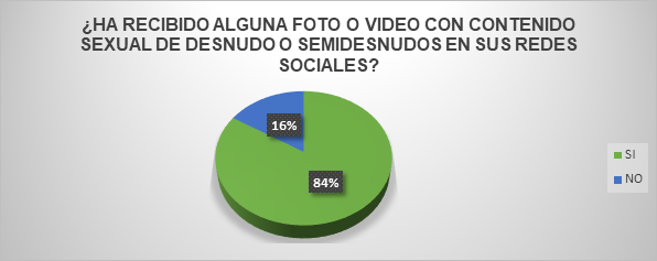 Al efectuar el análisis el 84% de los adolescentes encuestados manifestaron que en alguna ocasión han recibido fotos de contenido sexual, sea este por mensaje interno o por publicaciones a la que han tenido algún tipo de acceso. Un porcentaje menor 16% no han recibido este tipo de contenido.