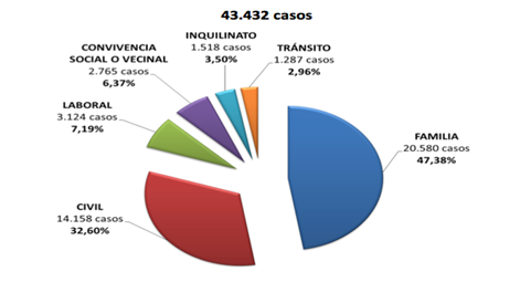 Se observa en la gráfica 1, que, del total de 43.432 caso del 2015, en materia laboral se presentaron 3.124 casos, lo que representó un 7,19 %.