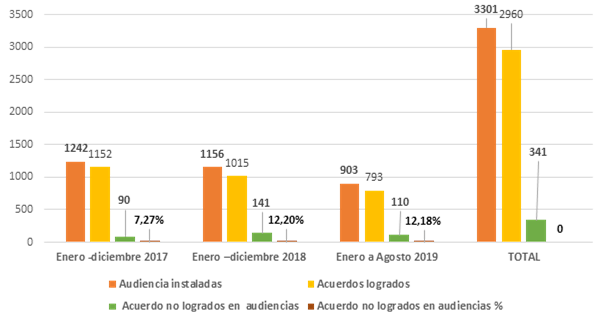 De un total de 3301 de audiencias instaladas ,que representa a 51,45% de los casos atendidos desde enero 2017- 2018 hasta agosto del 2019, logran acuerdos 2960 casos en materia familiar en alimentos y en cambio no logran acuerdos 2786 siendo el 48,69% en audiencias instaladas que no logran acuerdos en la oficina en el Centro de mediación de la función Judicial Santo Domingo de los Tsáchilas siendo este dato el total de casos en conflicto en familia en materia de alimentos de los casos atendidos, emitido por la Directora Dirección Nacional de Mediación de la Función Judicial y en Septiembre 2019.