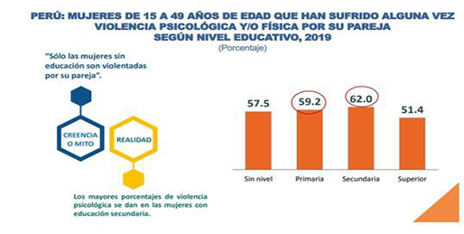 La Encuesta Demográfica y de Salud Familiar reporta que “el 63,2% de mujeres fueron víctimas de violencia ejercida alguna vez por el esposo o compañero, siendo mayor en las residentes en el área urbana (63,3%) y en aquellas mujeres con educación secundaria (69,4%). |