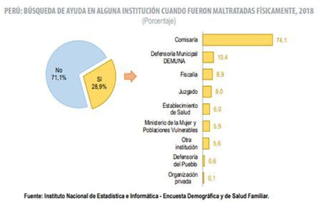 Ello significa que el 71.1 % no llegó a presentar una denuncia, debido al temor a la humillación, vergüenza o no saber dónde buscar el apoyo necesario. Según la misma encuesta, solo el 4.8% de las mujeres que sufrieron maltrato físico buscaron ayuda en personas cercanas. Con mayor frecuencia recurren a sus madres, a algún amigo, vecino o parientes. Y apenas el 28,9% de mujeres maltratadas físicamente denunciaron formalmente a sus agresores. La institución donde más recurren por apoyo es a las comisarías (74.1%), seguido por la Fiscalía y el Poder Judicial.