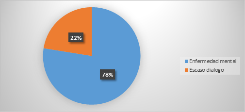 Los resultados de estas encuestas arrojan los siguientes resultados, 78% enfermedad mental y el 22% escaso dialogo, en el cual se puede evidenciar un alto porcentaje en la respuesta de enfermedad mental. La violencia contra la mujer es un acto inaceptable, según varios datos estadísticos consultados, la violencia de género ha ido en aumento a través del trascurso de los años, esto debido a que aún se conserva una creencia machista donde la mujer está en un estado de sumisión en la cual se debe de quedar en su domicilio, cuidando perennemente a los hijos y la atención de su pareja, en otros casos porque ya no se siente conforme en la relación de pareja y toma la decisión de terminarla y separarse, esto en ocasiones conlleva a que se presenten varios casos donde el hombre se siente herido y renuente a tal decisión.