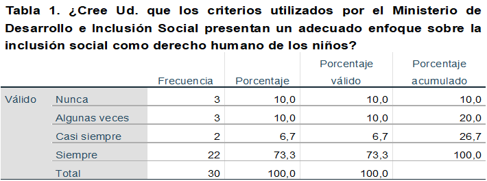 De la muestra encuestada, el 73,33% respondió que siempre los criterios utilizados por el Ministerio de Desarrollo e Inclusión Social presentan un adecuado enfoque sobre la inclusión social como derecho humano de los niños, el 6,67% restante indicó que era casi siempre, el 10% opinó algunas veces, el 0% casi nunca y el 10% restante nunca.