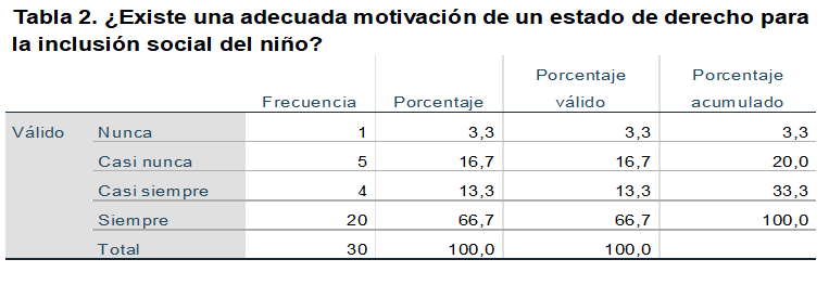 De la muestra encuestada, el 66,67% respondió que siempre existe una adecuada motivación de un estado de derecho para la inclusión social del niño, el 13,33% indicó que era casi siempre, el 0% opinó algunas veces, el 16,67% casi nunca y el 3,33% restante nunca.