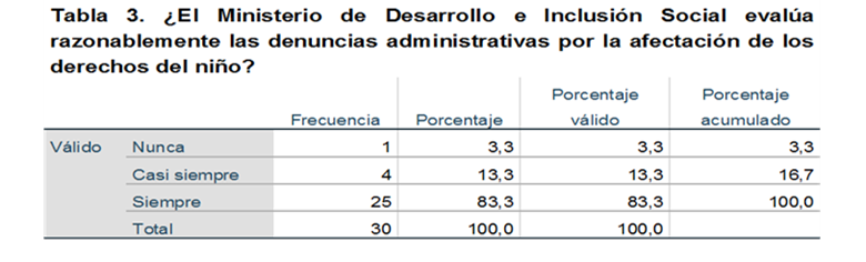 De la muestra encuestada, el 83,33% respondió que siempre el Ministerio de Desarrollo e Inclusión Social evalúa razonablemente las denuncias administrativas por la afectación de los derechos del niño, el 13,33% indicó que era casi siempre y el 3,33% restante nunca.