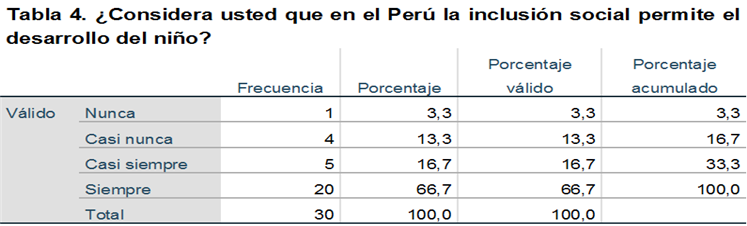 De la muestra encuestada, el 66,67% respondió que siempre considera que en el Perú la inclusión social permite el desarrollo del niño, el 16,67% indicó que era casi siempre, el 13,33% casi nunca y el 3,33% restante nunca.