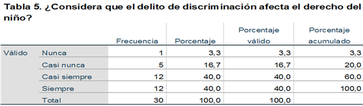 De la muestra encuestada, el 40% respondió que siempre considera que el delito de discriminación afecta el derecho del niño, otro 40% indicó que era casi siempre, 16,670% casi nunca y el 3,33% restante nunca.