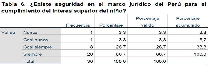 De la muestra encuestada, el 66,67% respondió que siempre existe seguridad en el marco jurídico del Perú para el cumplimiento del interés superior del niño, el 26,67% restante indicó que era casi siempre, el 3,33% opinó casi nunca y el 3,33% restante nunca.