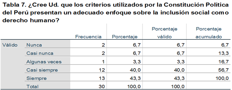 De la muestra encuestada, el 43,33% respondió que siempre los criterios utilizados por la Constitución Política del Perú presentan un adecuado enfoque sobre la inclusión social como derecho humano, el 40% indicó que era casi siempre, el 3,33% opinó algunas veces, el 6,67% casi nunca y el 6,67% restante nunca.