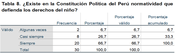 De la muestra encuestada, el 66,67% respondió que siempre existe en la Constitución Política del Perú normatividad que defienda los derechos del niño, el 26,67% indicó que era casi siempre y el 6,67% opinó algunas veces.