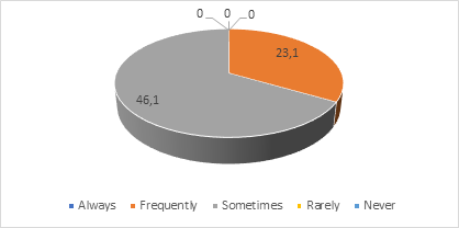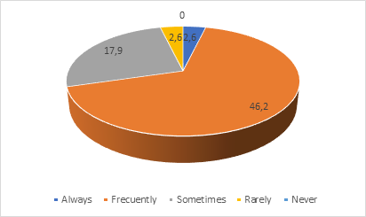 From table and figure 2, it was possible to show that of the students say the teacher sometimes uses audiovisual resources to develop the English class. The use of audio-visual increases learners’ communication skills so that trainees can concentrate on improving their skills through audio-visuals (Singh, 2018). These materials can be as good as the teacher when explaining concepts, facts, or demonstrating procedures, everything depends on the creativity used (Reyes et al. 2020). These authors also state audio-visual material has brought new opportunities to teachers and students to broaden and innovate the way how to teach and learn.