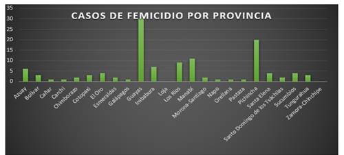 Durante el confinamiento por la COVID-19, se trazó un contexto violento, crítico y dramático que fragilizó y puso en indefensión a mujeres y niñas y que afecta a más del 50 % población. De acuerdo con las estadísticas presentadas un femicidio ocurre cada 72 horas. Además, se logró conocer los casos de Femicidio por provincias y los resultados arrojaron que el mayor número de casos fueron en Guayas, Pichincha, Manabí y Los Ríos, lo cual permite determinar que dentro de la Costa ecuatoriana hay un gran índice de femicidio.