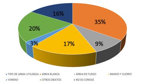 La Asociación Latinoamericana para el Desarrollo Alternativo Aldea manifiesta el tipo de armas que son usadas para cometer dicho delito, en el cual se determina que el 35% de femicidios se los comete con un arma blanca, el 9% con un arma de fuego, el 17% manos y cuerpo, el 3% con veneno, el 20% con otros objetos y el 16 % restante se desconocer.