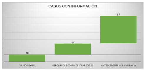 Los delitos de Femicidio ocurridos durante el año 2020 y de los cuales se posee la información completa La Asociación Latinoamericana para el Desarrollo Alternativo Aldea afirma que 10 de las víctimas fueron abusadas sexualmente, 15 mujeres fueron reportadas como desaparecidas y 37 de ellas habían reportado antecedentes de violencia. En lo cual se puede palpar como existen ya mujeres que buscan ayuda reportando la violencia en la que se encuentran viviendo.