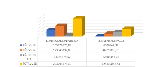En relación a las adquisiciones canceladas a través de convenios de pago y las efectuadas mediante procesos de contratación pública, se determinó en el año 2016, se realizaron adquisiciones por 112 379 513,20 USD, de los cuales 105 872 670,88 USD que representa el 94,21%, corresponde a procesos de contratación pública y 6 506 842,32 USD que representa el 5,79% a convenios de pago; en el año 2017, se determinó que se efectuaron adquisiciones por 219 374 689,55 USD, de los cuales 173 045 832,80 USD que representa el 78,88% corresponde a procesos de contratación pública y 46 238 865,75 USD que representa el 21,12% a convenios de pago; y en el año 2018 hasta el 30 de junio, fecha de corte del examen especial, se efectuaron adquisiciones por 86 678 018,98 USD, de los cuales 14 374 674,62, USD que representa el 16,58% corresponde a procesos de contratación pública y 72 303 344, 36 USD que representa el 83,42% a convenios de pago, demostrando que existió una tendencia de incremento en las adquisiciones canceladas a través de convenios de pago frente a las efectuadas por procesos de contratación pública”. (Contraloría General del Estado, 2019, pág. 449).