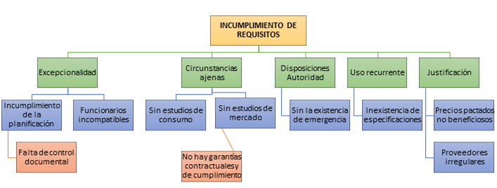 De conformidad a los requisitos de procedencia de la figura del convenio de pago establecidos por la PGE, en base al levantamiento de información de los 37 convenios de pago analizados por la Contraloria General del Estado en el examen especial, con los cuales se determinaron las 10 falencias o errores, se determina que el incumplimiento de los requisitos: (excepcionalidad, circunstancias ajenas, disposiciones autoridad, uso recurrente y justificación) procede de la incurrencia de diversas falencias, como se detalla a continuación: