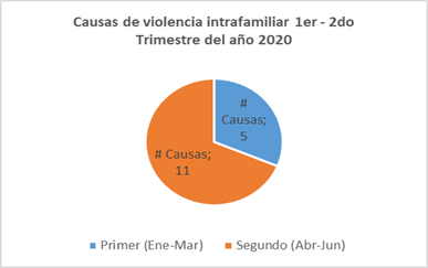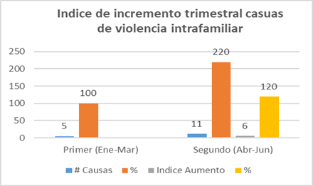 Es necesario referirnos al análisis del número de causas en los dos primeros trimestres del año 2020, en los cuales se observa un claro incremento en las causas de violencia intrafamiliar en las que se aumentan de forma numérica de 5 a 11 causas y porcentualmente del 100% a un 220%, es decir un índice de crecimiento del 120%.