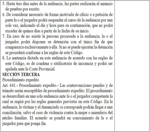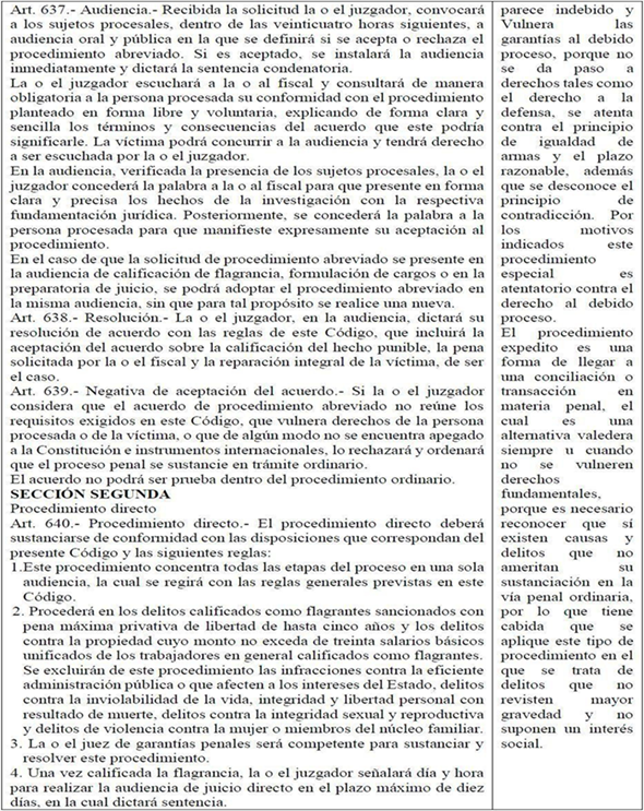 El procedimiento abreviado ha sido influenciado por legislaciones latinoamericanas, europeas, pero especialmente por la norteamericana, plea bargaining, pues, se han mantenido diferencias considerables. En este sentido, la contradicción; auto incriminación; recurrir o acceder a instancias; en judicial efectiva y en seguridad jurídica; los que son inherentes en procesos judiciales y procedimientos penales, ve coartada esta garantía constitucional que engloba los derechos descritos, porque impide disponer del plazo razonable y del ejercicio adecuado, lo cual no tiene cabida (Gutiérrez Campoverde et al., 2020). El criterio expresado líneas arriba se puede considerar como una postura que no necesariamente implique algún supuesto beneficio al imponer una pena en breve tiempo.