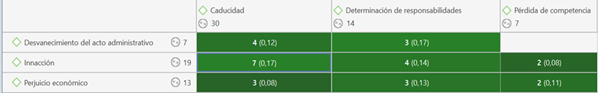El análisis mediante la plataforma informática de análisis cualitativo ATLAS TI versión 9, mostró diferentes coocurrencias entre los diferentes códigos programados, la figura 1 muestra la relación de coocurrencia de frecuencia entre los procesos de inacción y la caducidad de forma mayoritaria esto indicaría que las 2 variables están relacionadas directamente en base a que una inacción material conduce directamente a la caducidad del proceso, de la misma manera la determinación de responsabilidades se ve mermada por el desvanecimiento del acto administrativo y de igual manera el pérdida de la competencia corresponde según los entrevistados con el perjuicio económico al estado, la caducidad además está conectada de forma muy fuerte con el desvanecimiento del acto administrativo. De forma minoritaria y no menos importante la pérdida de competencia fue citada en base a la inacción y el perjuicio económico del Estado que se ve relacionado con la pérdida de la competencia ya que al tener esta situación no se podría establecer ningún tipo de responsabilidad ni civil, administrativo o penal ni mucho menos recuperar el perjuicio generado al Estado en la parte económica.