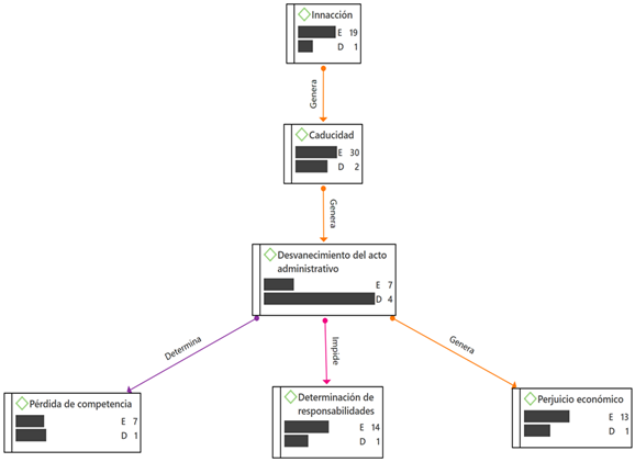 En base a los elementos generados mediante el análisis cualitativo, se puede observar las relaciones generadas a partir del ámbito de las entrevistas, donde el elemento de mayor densidad corresponde al desvanecimiento del acto administrativo que es producto tanto de la inacción como de la caducidad, además existe interacción que determina la pérdida de la competencia, el impedimento a la determinación de responsabilidades y la generación del perjuicio económico al Estado.