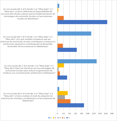 La evaluación del nivel de adopción de prácticas de reciclaje y reutilización en las empresas de Babahoyo es fundamental para comprender el estado actual de la implementación de estrategias de economía circular en la región. Cuando la mayoría de los encuestados respondieron con "Muy bajo" en esta pregunta (1 en la escala de 1 a 5), Los resultados podrían indicar una falta de conciencia y comprensión sobre la importancia de las prácticas de reciclaje y reutilización en las empresas manufactureras del cantón Babahoyo.