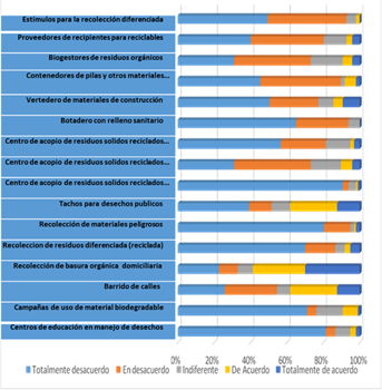 Los resultados de la encuesta demostraron que la mayoría de los servicios que debía proporcionar el GAD municipal de Baba no se han implementado siendo los más precarios los estímulos para promover la recolección diferenciada, el reconocimiento de proveedores autorizados de contenedores diferenciados para manejo de residuos inorgánicos, los biogestores que aprovechen los residuos domiciliarios orgánicos, así como los espacios de recolección de materiales peligrosos, de construcción y de desechos municipales para reciclar, además de campañas de uso de material biodegradable y de educación en el manejo de desechos. Respecto a los servicios que si consideran recibir ocasionalmente están la recolección de residuos sólidos, tachos de basura, barrido de calles y centros particulares de reciclaje y los servicios que son concebidos por la mayoría de los encuestados como presentes permanentemente son la recolección de basura orgánica y el barrido de las calles, con estos datos se concluye que de 16 servicios que promulga la ordenanza de manejo integral de residuos sólidos del cantón Baba, únicamente 2 se reciben como permanente y 2 de manera ocasional.