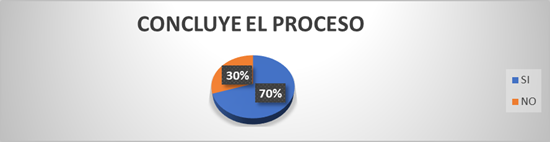El 70% de la supuesta víctima si concluyen con todo el proceso de juicio de contravenciones de Violencia Intrafamiliar, y el 30% no, por falta de dinero, tiempo, factor miedo o simplemente solo querían medidas de protección y que ya no les golpeen más. (Figura 3).