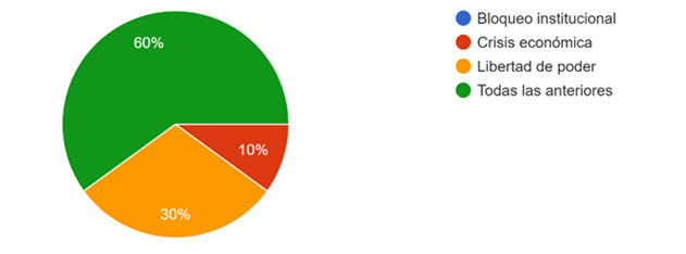 Según la figura 2, el 60% de las personas manifiestan que el bloqueo institucional, la crisis económica y la libertad de poder son las principales consecuencias que durante estos meses se hayan emitidos solo decretos ley por parte del primer mandatario, pues el 30% aseguran que la libertad de poder que tiene actualmente el Presidente es la consecuencia primordial de la muerte cruzada, y para concluir el 10% se trata de la crisis económica que afecta en el país y se va haber afectado por decretos ley.