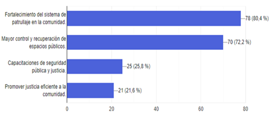 Según la figura 4, las dos actividades seleccionadas por los encuestados son: patrullaje en la comunidad, con un 40,20% y por otro lado un mayor control en la recuperación de los espacios públicos con un 36,08%. Son acciones encaminadas a disminuir los índices de delincuencia en la zona, lo que vulnera la paz como bien común en el sector de Alpachaca.