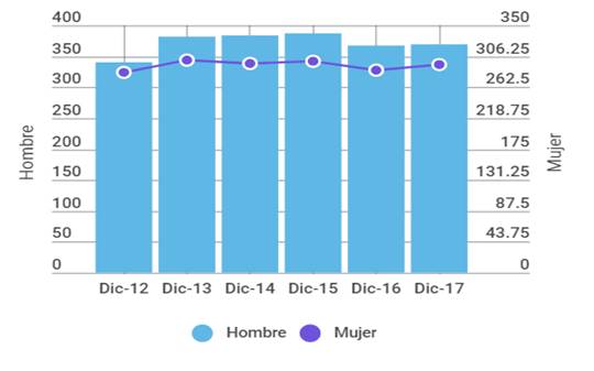 En efecto, como se puede apreciar en la figura 1, pese a todos los logros obtenidos por las distintas luchas de las mujeres trabajadoras, entre 2012 y 2017 en la república del Ecuador, no existió igualdad en cuanto a los sueldos y/o remuneraciones de hombres y mujeres, siendo un hecho de que los hombres recibieron remuneraciones más altas que las mujeres, partiendo desde cargos operativos hasta oficinistas.