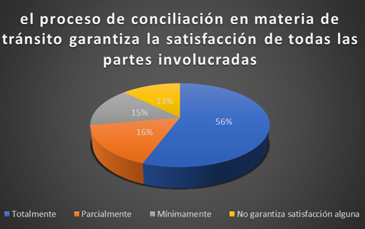 En la figura 3, se evidencia que el 100% de encuestados (jueces y abogados), solo el 56%, manifestaron el proceso de conciliación en materia de tránsito garantiza totalmente la satisfacción de todas las partes involucradas. Por su parte el 16% declararon parcialmente. Y sólo el 15% expresaron mínimamente. Y sólo el 13 % de encuestadas declararon no garantiza satisfacción alguna.