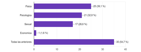Ante los datos obtenidos en la pregunta 4 se puede observar que todas son causantes de violencia, sin embargo, el tipo de violencia que encabeza el primer lugar es la agresión física con un porcentaje de (39,1%), por consiguiente, el maltrato psicológico con un (32,8%), seguido de la sexual con un (26,6%), por último y de menor acogida la económica con (1,6%) (Figura 4).