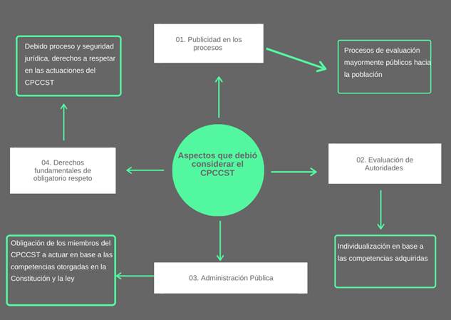 A continuación, se presentará la Figura 1, en la cual constan los aspectos que el CPCCST debió considerar en su actuar a fin de que sus decisiones sean apegadas a los preceptos constitucionales y en el límite de las atribuciones conferidas por la consulta popular de febrero de 2018.