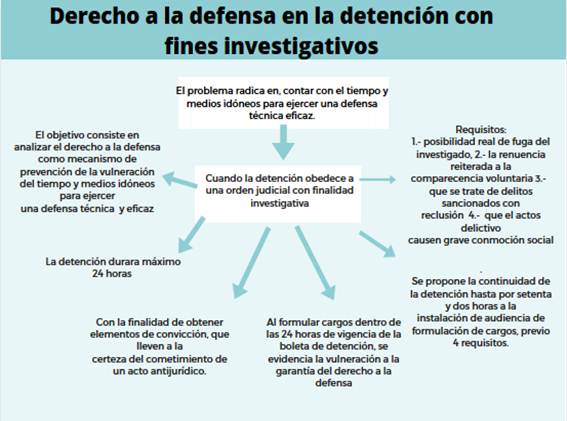Atendiendo estas consideraciones, se pretende demostrar la real vulneración del derecho a la defensa de los procesados en el Ecuador, cuando su detención obedece a una orden judicial con finalidad investigativa. El problema radica en impedir a las personas detenidas con fines investigativos, contar con el tiempo y medios idóneos para ejercer una defensa técnica eficaz, como lo consagra la Constitución de la República del Ecuador, cuando se pretende formular cargos sin contar con el debido tiempo de notificación para ejercer su defensa. En este contexto, el objetivo de la presente investigación consiste en analizar el derecho a la defensa en la detención con fines investigativos como mecanismo de prevención de la vulneración del tiempo y medios idóneos para ejercer una defensa técnica y eficaz (Masabanda Analuiza, Aman Llerena, Montero Solano & Javier Analuiza, 2019).