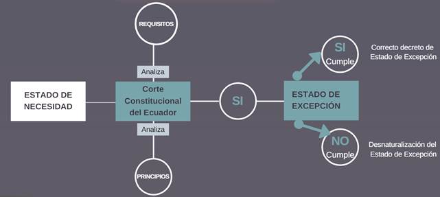En cambio, el art 121 de la misma ley brinda las pautas para “que la Corte Constitucional realice un seguimiento material de la declaratoria del estado de excepción, verificando al menos lo siguiente. Que los hechos constitutivos de la declaratoria configuren 1. una agresión, un conflicto armado internacional o interno; 2. grave conmoción interna, calamidad pública o desastre natural; 3. Que los hechos constitutivos de la declaratoria no puedan ser superados a través del régimen constitucional ordinario y 4. Que la declaratoria se decrete dentro de los límites temporales y espaciales establecidos en la Constitución de la Republica”. Es decir, el fundamento es lógico su implementación radica en una normativa, pero cuanta separación de poderes existe en el Estado, para que esta declaratoria sea bien estructurada y fundamentada.