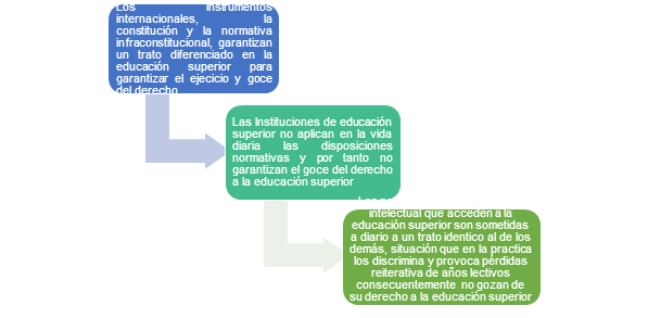 Los casos analizados evidencian que las universidades e institutos de educación superior en Ecuador no cumplen con sus obligaciones como representantes estatales, vulnerando y no garantizando el derecho a la educación superior en igualdad de oportunidades de las personas con discapacidad intelectual y en consecuencia su inclusión en la sociedad. La enunciación constitucional que asegura que Ecuador es un país inclusivo no es más que aún una meta a alcanzar (ver figura 1).